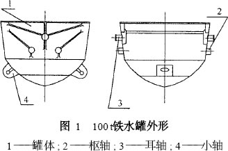 鐵水罐是冶金行業(yè)使用非常廣泛的一種設(shè)備,它的作用是裝運煉鐵廠生產(chǎn)出來的鐵水,并通過鐵水罐車將其運送到鑄鐵車間鑄鐵或煉鋼廠煉鋼。煉鐵廠100 t鐵水罐型號為ZT -100 - 1型,其結(jié)構(gòu)的特點是罐臂(包括圖1所示2, 3部分)采用鑄造,罐身采用焊接,罐臂與罐身互焊。