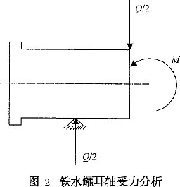 36只鐵水罐耳軸原直徑為φ310 mm,磨損后其直徑分布為φ260 mm ~φ 280 mm不等,鐵水罐中心線偏離原中心線10~20mm。從而導(dǎo)致鐵水罐不能安全使用。而且,耳軸表面凹凸不平也加速對鐵水罐吊鉤襯瓦的磨損。因此必須對耳軸的強度進(jìn)行校核,并采取相應(yīng)表面修復(fù)措施修復(fù)鐵水罐耳軸。