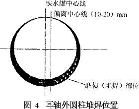 對煉鐵廠100 t鐵水罐的耳軸磨損進(jìn)行了分析,通過耳軸彎曲強度核算,確認(rèn)需修復(fù)磨損量。通過對焊縫強度校核,證明更換耳軸的方案不可行,從而選用耳軸表面堆焊的處理工。焊后采用退火處理,以消除焊接殘余應(yīng)力,效果良好。